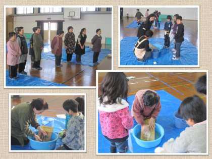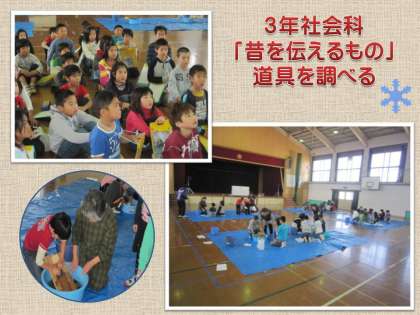 地域女性会の皆様のご協力により,3年生の社会科の授業「昔を伝えるもの」〜昔の道具・洗たく板を使う〜が行われました。十数名の地域の皆様が集まって下さったおかげで,とても内容の濃い体験的な活動ができました。