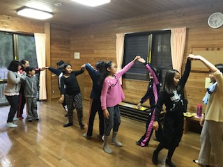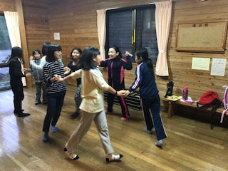 そのころ、宿泊棟では、キャンドルファイヤーが待ちきれずフォークダンスの練習が始まりました!本番でも上手に踊れるかな?