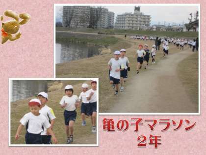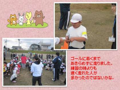 それほど寒くもない,絶好のマラソン日和だったかな。2年生のみんなも,最後まであきらめずに頑張って走りました。走り出した時は,「無理だあ。」という顔をしていた子どもたちも,途中から,それぞれが真剣な面持ちで走り出しました。「自分の力はこれくらいだよ。」と思い込んでしまってはいけません。シンドイところで頑張りました。そこに値打ちがありましたね。