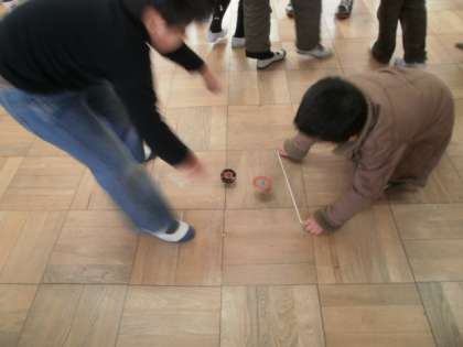去年は,回し方を教えてもらう立場だった子どもたちが,今日は,1年生にこまの回し方や技を教える番です!!