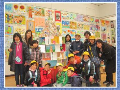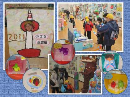 作品はとても美しく展示されていて,ひまわり学級の子どもたちも,その他大勢の子どもたちも,まさに「小さな巨匠たち」になっていました。素晴らしかったです。工夫された共同作品(立体)には,子どもたちが手でふれられるものもたくさんあり,夢中になって遊んでいました。また自由テーマで描いた平面作品が,壁面いっぱいに展示してありました。