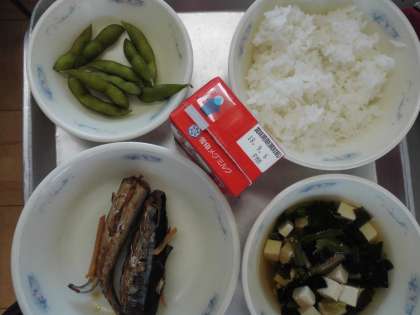 本日の献立は,「えだまめ」「さんまのかわりに」「ぎゅうにゅう」「ごはん」「すましじる」です。