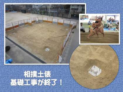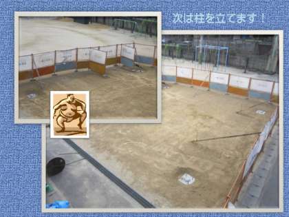 相撲の土俵づくりは,地域や保護者の皆様のご支援を頂きながら,順調に進んでいます。養生も終わり,埋め戻しをして,基礎工事を終了しました。とてもしっかりした基礎をつくって頂きました。次に柱を建てることになります。