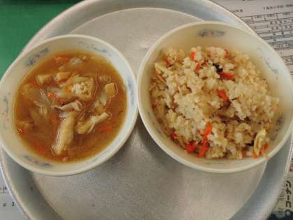 本日の献立は,「五目ごはん」(アルファ化米)・豚汁・牛乳でしたが,昨日の台風によって停電した為,冷蔵庫の牛乳が飲めなくなりました。本日,プリントを持ち帰っていますのでご確認ください。