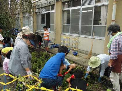 園芸委員会では,花壇の雑草を抜いたり,切り戻しを行っていました。