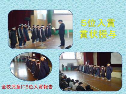 その後,1月下旬に行われた『亀の子マラソン』の各学年男女3位までの子どもたちが,校長先生から賞状を受け取りました。表彰された子,表彰の時拍手をしている子,どの子どももとても素敵な表情をしていました。その他にも図工の作品に関する入選者の紹介,給食委員会からのお知らせがありました。