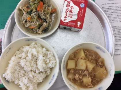 本日の献立は,「もやしのにびたし・ぎゅうにゅう・むぎごはん・じゃがいものそぼろに」です。