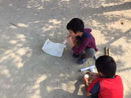ストローを何本も束ねて一気にたくさんのシャボン玉を作ったり,筒の口が大きなものを使ってゆっくりと息を入れ,大きなシャボン玉を作ったりとそれぞれがおもいおもいのシャボン玉を作っていました!!