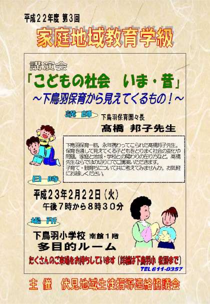 「第3回 家庭地域教育学級」の講演会が2月22日(火)午後7時から8時30分まで,本校の多目的ルームにて行われます。今回の講演会は,下鳥羽保育園 園長 高橋邦子先生を講師にお招きします。下鳥羽保育一筋に取り組んで来られた高橋先生です。子育てについていろいろなお話しをしていただけると思います。お忙しいとは存じますが,ご参加くださいますようお願いいたします。