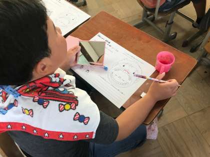 授業ではプラークテストを行い、歯垢を赤く染めだして、