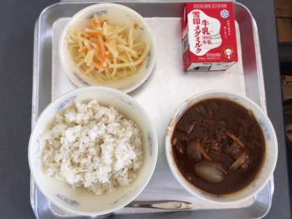 本日の献立は,「じゃがいものソテー・ぎゅうにゅう・むぎごはん・ハッシュドビーフ」です。