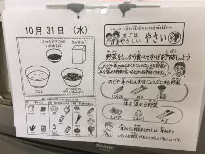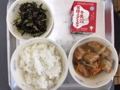 本日の献立は,「こまつなとひじきのいためもの・ぎゅうにゅう・ごはん・あつあげのやさいあんかけ」です。