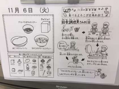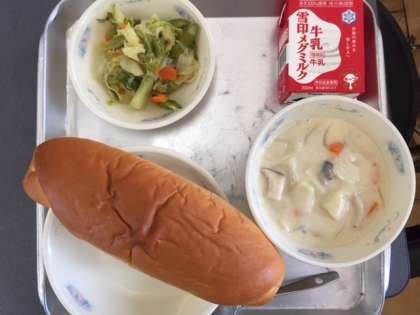 本日の献立は,「アスパラガスのソテー・ぎゅうにゅう・あじつけコッペパン・きのこのクリームシチュー」です。