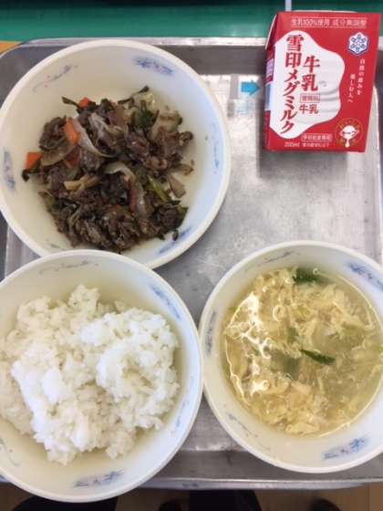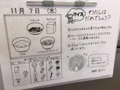 本日の献立は,「プルコギ・ぎゅうにゅう・ごはん・レタスとたまごのスープ」です。