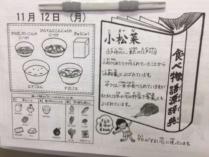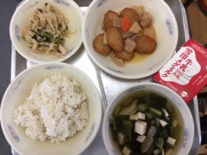 本日の献立は,「きりぼしだいこんのにつけ・ひらてんとこんにゃくのにつけ・ぎゅうにゅう・むぎごはん・すましじる」です。
