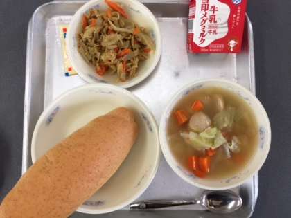 本日の献立は,「マヨネーズ・ツナごぼうサンドのぐ・ぎゅうにゅう・ぜんりゅうふんパン・ソーセージとやさいのスープに」です。