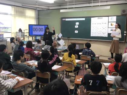 4年生は前回の英語学習で習得した文房具をビンゴゲームを通して復習し,たずねたり,答えたりしながら英語に親しんでいました☆