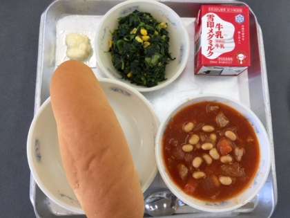 本日の献立は,「かたチーズ・ほうれんそうのソテー・ぎゅうにゅう・コッペパン・ポークビーンズ」です。