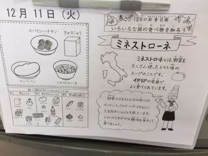 本日の献立は「スパイシーチキン・ぎゅうにゅう・コッペパン・ミネストローネ」です。