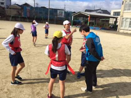 どこからか音楽が…運動場を見ると6年生が「タグラグビー」の準備をしていました。