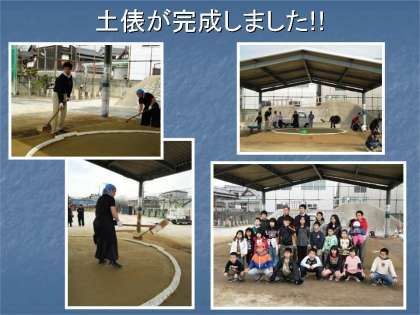 保護者の方々も土俵のまわりに土を入れ,そして固めてきれいに整地していただきました。立派な土俵の完成です。本当に保護者の皆様,地域の皆様,そして峰崎部屋の皆様ありがとうございました。