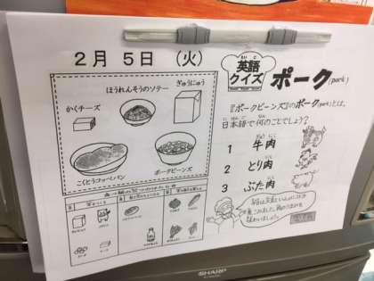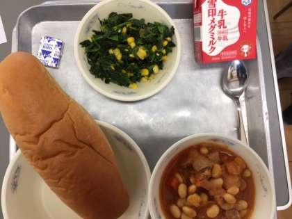 本日の献立は「かくチーズ・ほうれんそうのソテー・ぎゅうにゅう・こくとうコッペパン・ポークビーンズ」です。