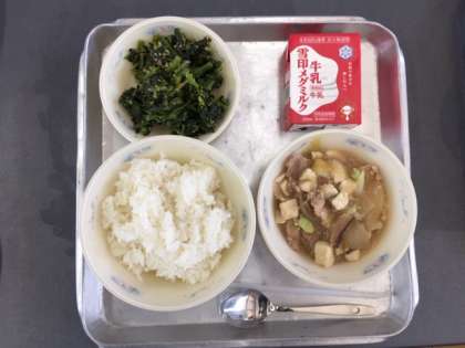 本日の献立は,「ほうれんそうのごまに・ぎゅうにゅう・ごはん・ぶたにくととうふのくずに」です。