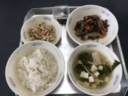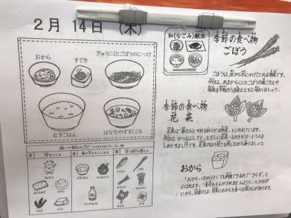 本日の献立は「おから・すぐき・ぎゅうにくとごぼうのにつけ・むぎごはん・はななのすまし汁」です。すぐきのお漬物がついていました!!