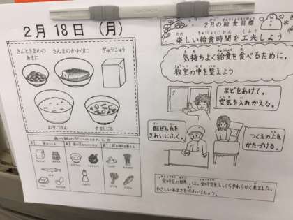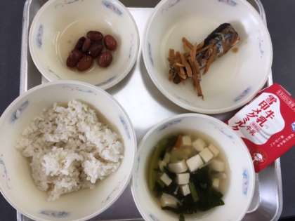 本日の献立は「きんときまめのあまに・さんまのかわりに・ぎゅうにゅう・むぎごはん・すましじる」です。