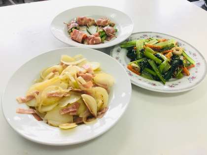 ジャーマンポテト,ちくわとゆで野菜のごまあえ,ベーコン巻きの