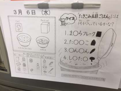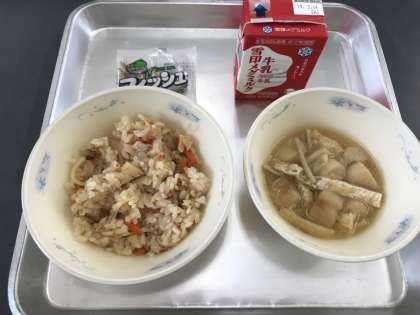 本日の献立は「じゃこ・ぎゅうにゅう・たきこみごもくごはん・みそしる」です。