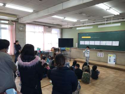 1年生は今日の参観授業で,小学校に入学してからできるようになったことを,保護者の皆さんに発表していました。