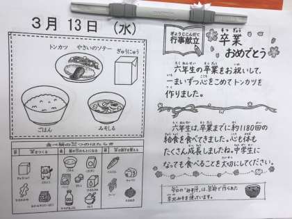 本日は卒業献立で「トンカツ・やさいのソテー・ぎゅうにゅう・ごはん・みそしる」です。給食調理員さんが1枚1枚心を込めてトンカツを作ってくださいました!!