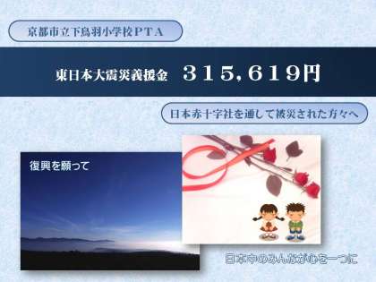 過日,東日本大震災で被災された皆様への義援金を集めさせて頂くことをお知らせしたところ,わずかな期間に大変多くの御協力をして頂きました。本当に有難うございました。日本赤十字社にこの義援金を託しましたことをご報告いたします。