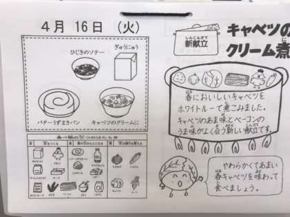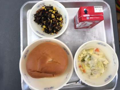 本日の献立は,「ひじきのソテー・ぎゅうにゅう・バターうずまきパン・キャベツのクリームに」です。