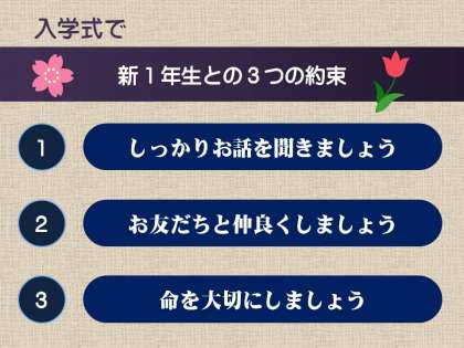 これが三つの約束です。よくわかりましたか。これらの約束をしっかり守り,明日から元気よく学校に来てください。