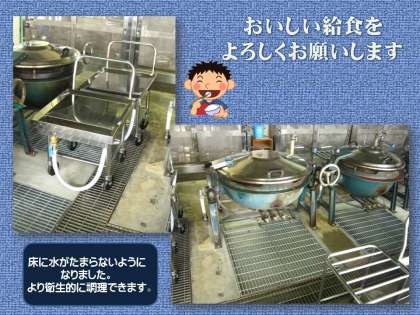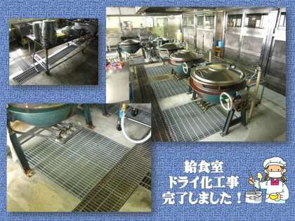 この春休みには,本校の給食室をドライ化する工事が進められていました。明日からの給食開始に備えて,先日,この工事が完了しました。従来の方法では,水を流し床をいつも濡れた状態で使いながら調理をしていましたが,これからは,水は溝の部分に落としてしまい,床を乾かした状態で使うことになります。この方がより衛生的なのだそうです。明日から給食が始まります。給食調理員さん,どうかよろしくお願いします。