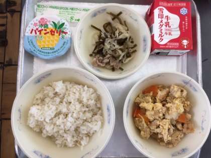 本日の献立は「パインゼリー・クーブイリチー・ぎゅうにゅう・むぎごはん・あぶらあげのチャンプル」です。