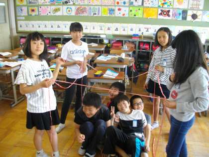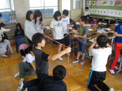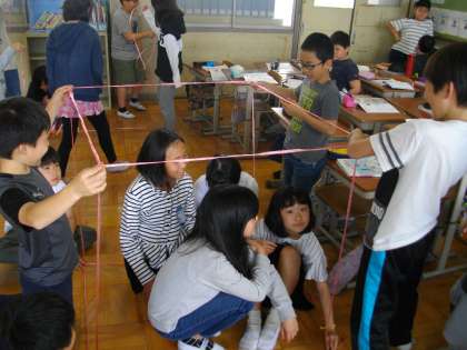 算数で体積の学習をしています。みんなで協力して1立方メートルを作り,どれくらいの大きさか体感しました。