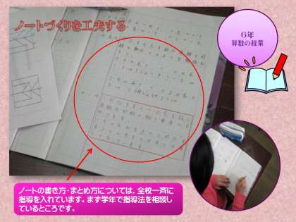 本校では,子どもがノートを書くことに指導の大きなポイントを置いています。つまりノートづくりを工夫するような子どもを育てたいと思っているのです。ノートが整理されまとめられていることと,子どもの主体的な学びとは大きく関係があると考えています。