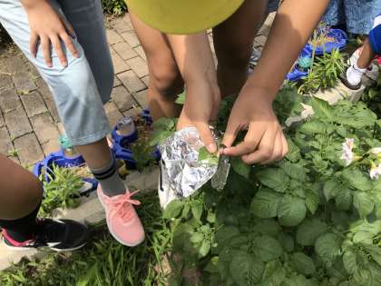 植物の成長に日光が必要なことは5年生で学習しました。6年生では,植物の葉に日光があたることで,でんぷんができるということを新しく学習します。前日に葉をアルミホイルで覆い,日光が当たらないように条件をそろえるなど,実験のねらいを一つ一つ確かめながら行っていました。