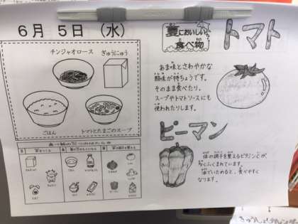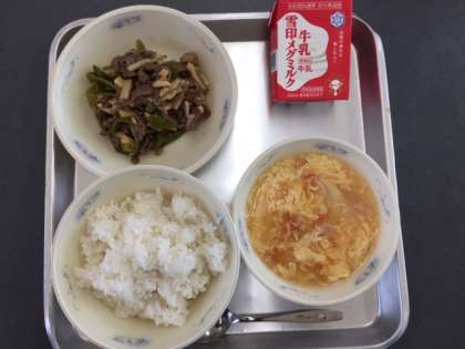 本日の献立は「チンジャオロース・ぎゅうにゅう・ごはん・トマトとたまごのスープ」です。夏野菜がたくさん使われています!!