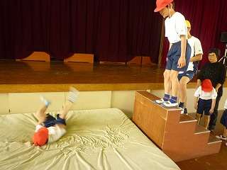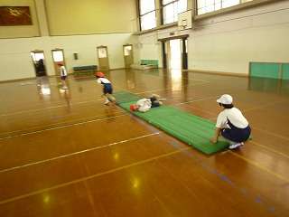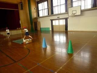 跳び箱やマット,フープ,コーン・・・いろいろな物を自分のできるやり方で乗り越えていました。