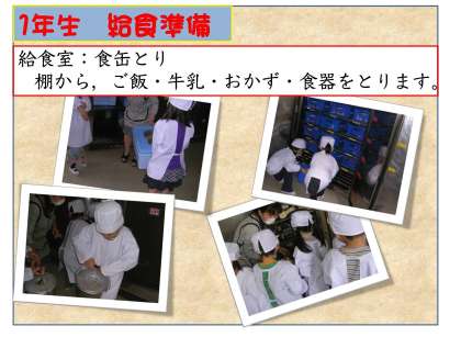 このような給食当番の手順を,1年生の担任は一つ一つていねいに指導していきます。初めは時間がかかりますが,慣れるに従ってだんだんはやくなります。担任に言われなくても何をすればよいのか分かるようになります。