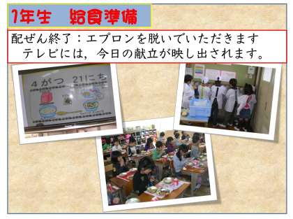 配ぜんが終わりました。給食当番はエプロンを脱いできちんとたたんで袋に入れます。次の日のために大切なことです。テレビには給食カレンダーが自動的に映ります。食器の置き方が示されます。また,どのように食べるのか示されることもあります。当番の着替えが終わり,みんな着席したら「いただきます!」