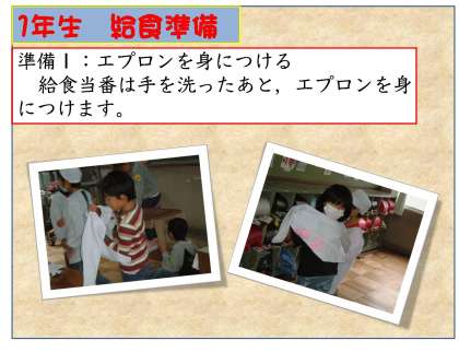 学校生活の中で,「学習」は国語や算数の教科学習だけではありません。給食当番の活動も集団生活をするための大切な活動です。1年生の学習の中で最初にする学習の一つです。どのような活動をするのか,1年生の担任の指導の下,最初にしっかりと給食当番の手順を覚えていきます。