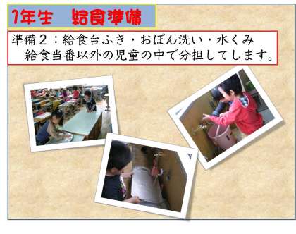 次に,給食当番が給食室から戻ってくるまでに,当番以外の児童の何人かが,給食台ふき・おぼん洗い・牛乳パックを洗う水くみに行きます。その他の児童は自分の席について静かに待ちます。