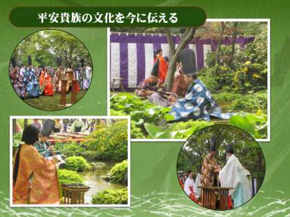 4月29日に,私たちの校区内にある『城南宮』で,「曲水の宴」が行われました。平安貴族の衣装を身に付けた歌人たちが,遣水に沿って酒杯が流れる間に和歌を詠むという,平安時代の宮中行事を再現したものです。『城南宮』の平安の庭で,毎年春と秋に行われます。
