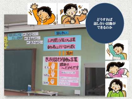 各教室には,活発に話し合い活動をするためのルールを掲示しています。これは各学年で相談しながら決めたものです。まず,こうしたルールを守りながら学習経験を重ねます。そして,学級集団が育ってくれば,ルールにとらわれ過ぎず,より自由自在な意見交流ができるようになるのでは…と思っているのです。