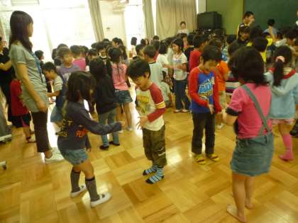 ひまわり学級の子が自己紹介をし,ゲームなどを通していろいろな学年と交流をしました。交流が終わった後,子どもたちはハイタッチをしていました。